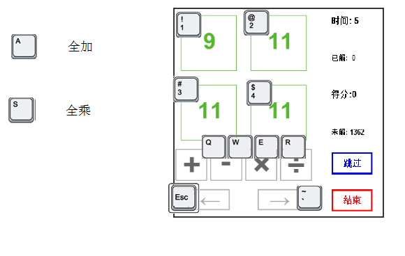 S 键把所有剩下的数相乘。 比如, 如果你还剩 8 8 8, 解法当然是 8 + 8 + 8, 你只需要按 A 键就可以了。 这比你用鼠标点击5下要快多了。其它快捷键看以下图示。如果你用传统键盘,有数字小键盘, 那么你也可以按 4 当点击上左, 按 5 当点击上右, 按 1 当点击下左, 按 2 当点击下右。